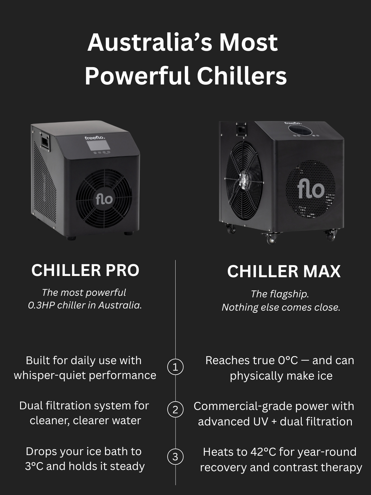 • The Flo Vault or Flo Axis + Max Chiller is our flagship combination — designed for serious users, athletes, or families who want the most powerful cooling and heating available. The Max reaches 0°C, heats to 42°C, and is even capable of making ice, making it the most advanced unit in Australia.