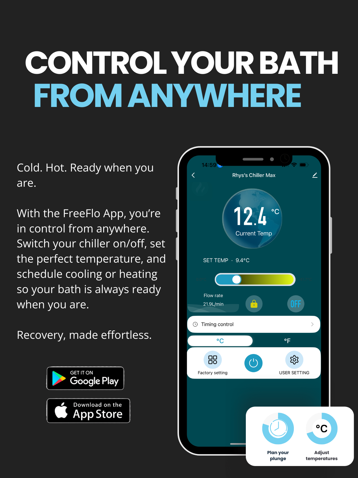 Graphic showing Freeflo ice bath chiller controlled via smartphone app for temperature adjustment.